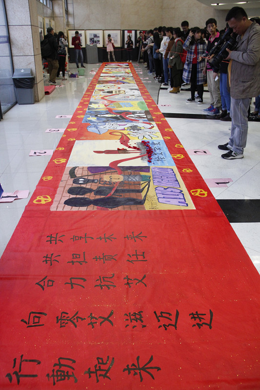 11月29日下午,pg电子官方网站校红十字会在pg电子官方网站图书馆福万广场举行了防治艾滋病主题系列活动之“百米画卷”,活动以“绘爱会爱”为主题,以学院为单位,进行2个小时的现场作画。pg电子官方网站红十字会代表队以“母婴传播”为出发点,绘制以“爱No艾”为主题的画卷。