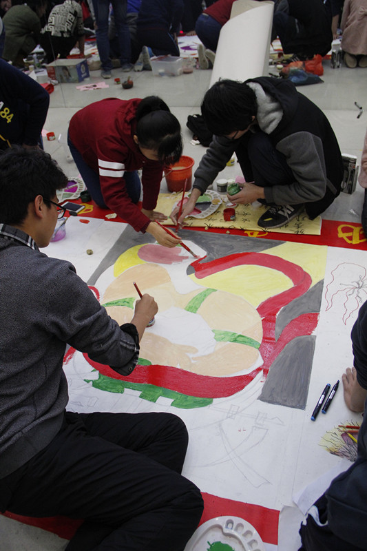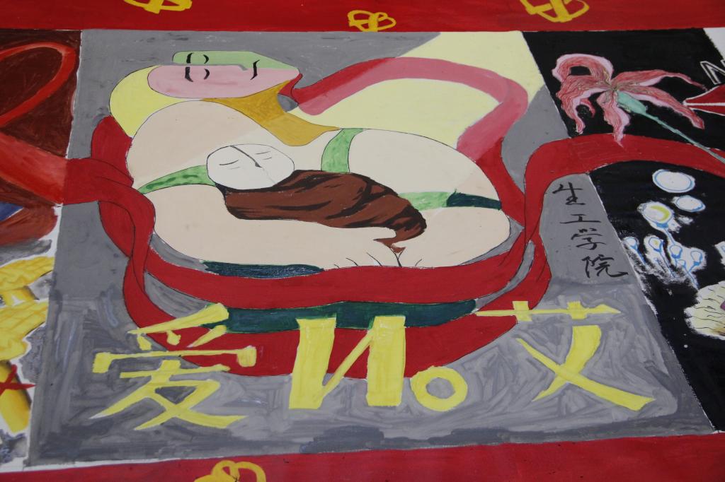生工红十字会会长钟俊华、宣传部部长陈敏芳带领部员一起完成此次活动。比赛现场参赛人员分工有序,全神贯注地投入作画之中。据解说员介绍,画作主体表现的是一个身患艾滋病的怀孕母亲。一半红一半绿的脸表现她喜忧参半的内心。在母亲腹部的上方一束光照耀着胎儿,胎儿的周围飘扬一条红丝带。画作表达人们对胎儿的期待与关爱,传达人们对生命的呵护与尊重。