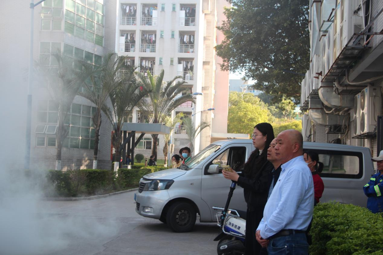 下午3:00,消防警报响起,公寓内烟幕弥漫,楼层志愿者对公寓内的学生进行疏散引导,用湿毛巾捂着口鼻、躬着身子依次离开宿舍,并按指定逃生路线迅速地从宿舍楼撤离到食堂广场空旷地带。整个演练过程严肃有序,现场效果良好。